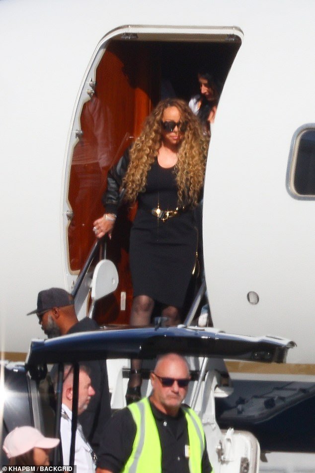 A mulher de 56 anos estava deslumbrante em um vestido preto justo e uma jaqueta de couro curta ao descer do avião