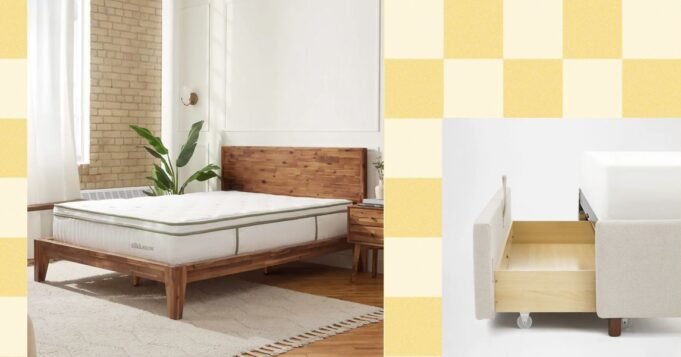 entre nós Guia de compra de estrutura de camaSilk & Snow diz que você pode conseguir mais com esta estrutura de cama, mas atualmente está com 20% de desconto. A montagem é um pouco difícil. No entanto, a cabeceira estofada é linda e a estrutura é resistente. Minha parte favorita é a gaveta habilmente escondida na base da moldura, que abre e fecha com duas divisórias e ímãs. Acho um pouco desconfortável abrir e fechar gavetas quando meu parceiro está na cama, mas gosto de ter espaço de armazenamento extra no meu quarto, principalmente porque essa moldura é muito baixa e não consigo esconder as coisas embaixo.