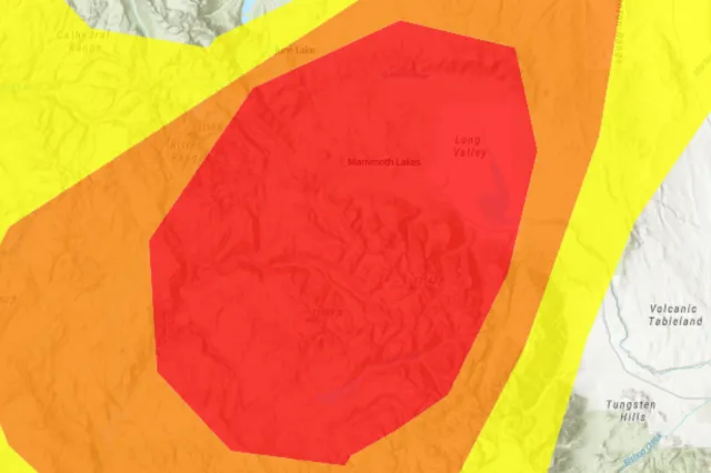 O mapa mostra partículas finas poluição (PM2,5) em uma área do Golden State – incluindo Mammoth Lakes, Whitmore Hot Springs e Mono Hot Springs – atingiu um nível “insalubre” de acordo com o Índice de Qualidade do Ar (AQI).