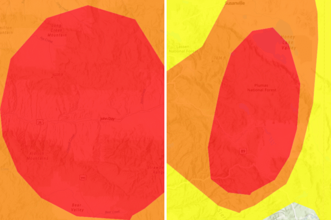 Milhares de residentes foram aconselhados a permanecer em casa Califórnia— com portula — e Óregon—incluindo John Day—devido aos níveis de partículas finas poluição (PM2.5) atingiu níveis “não saudáveis” a partir das 2h45 (ET) de domingo, 18 de janeiro. Mapa AirNowProduzido por Agência de Proteção Ambiental (EPA)
