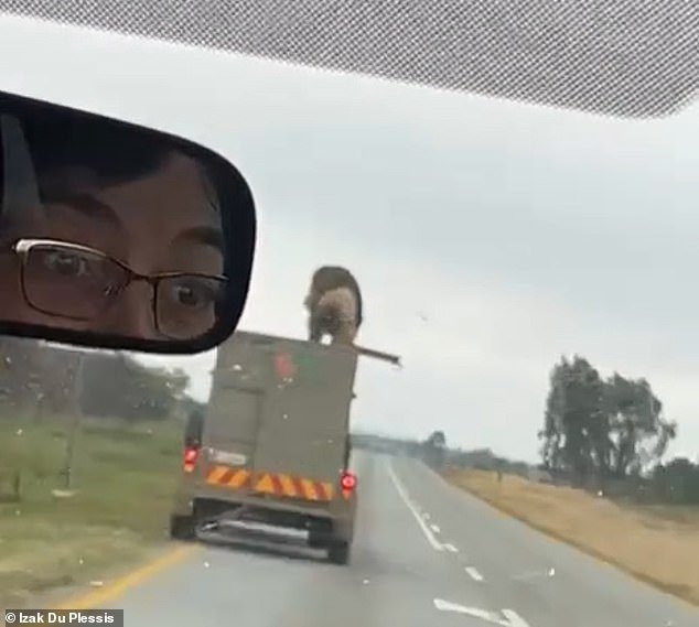 Um caminhante viajando na estrada R49 entre Bakersville e Lichtenberg capturou um vídeo do leão macho fugindo do teto de um caminhão.