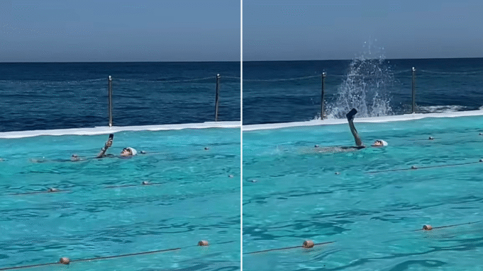 Um nadador foi flagrado usando um telefone enquanto nadava na piscina do famoso Bondi Iceberg, em Sydney.