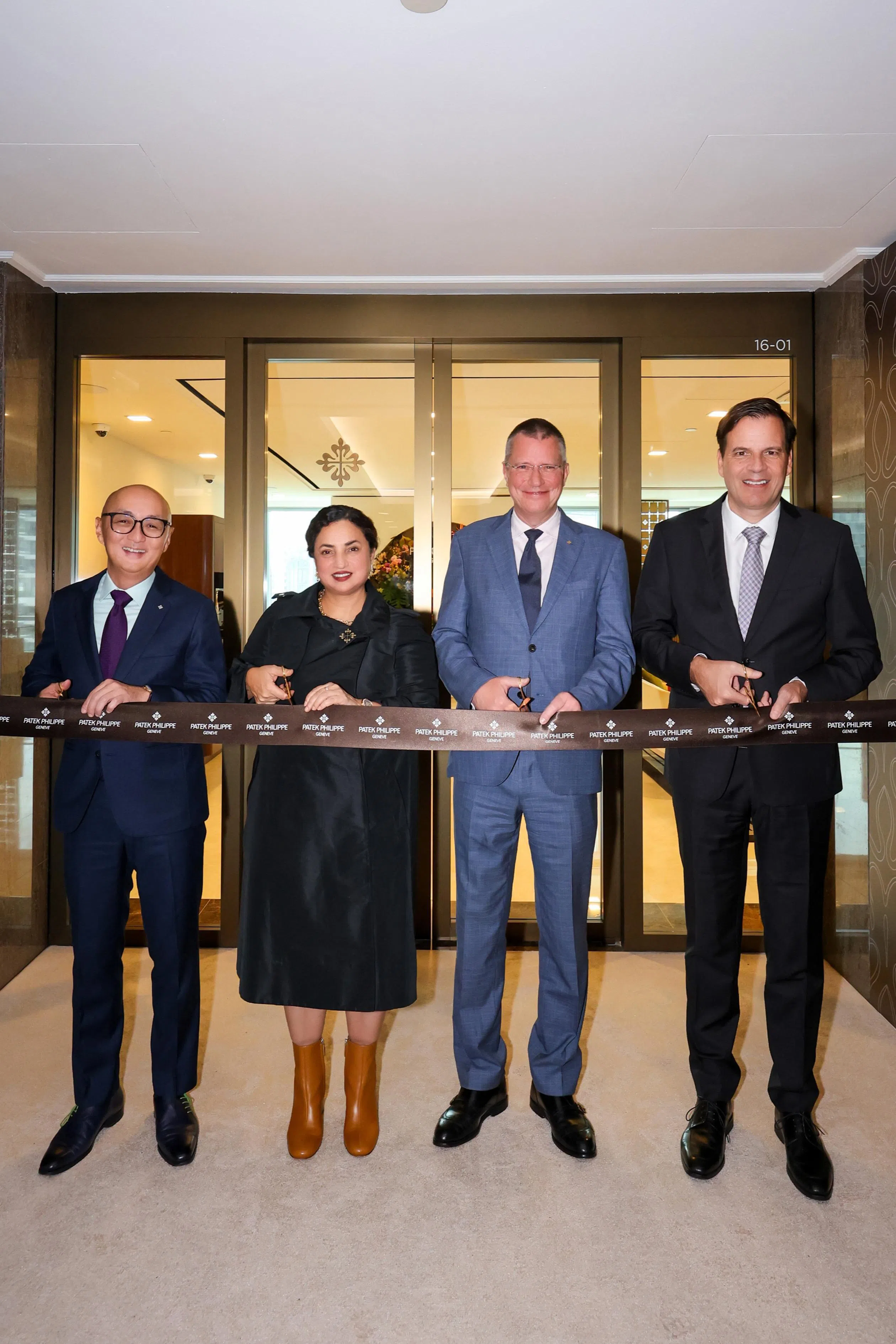Participaram da reabertura do Centro de Serviços Patek Philippe em Cingapura (a partir da esquerda) Gerald Sen, diretor regional de atendimento ao cliente Patek Philippe SEA; Sra. Deepa Chatras, Diretora Geral da Patek Philippe SEA. François Border, Diretor do Centro de Serviços Internacionais Patek Philippe. e Sr. Frank Glatter, Embaixador da Suíça em Cingapura.