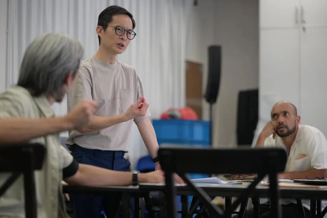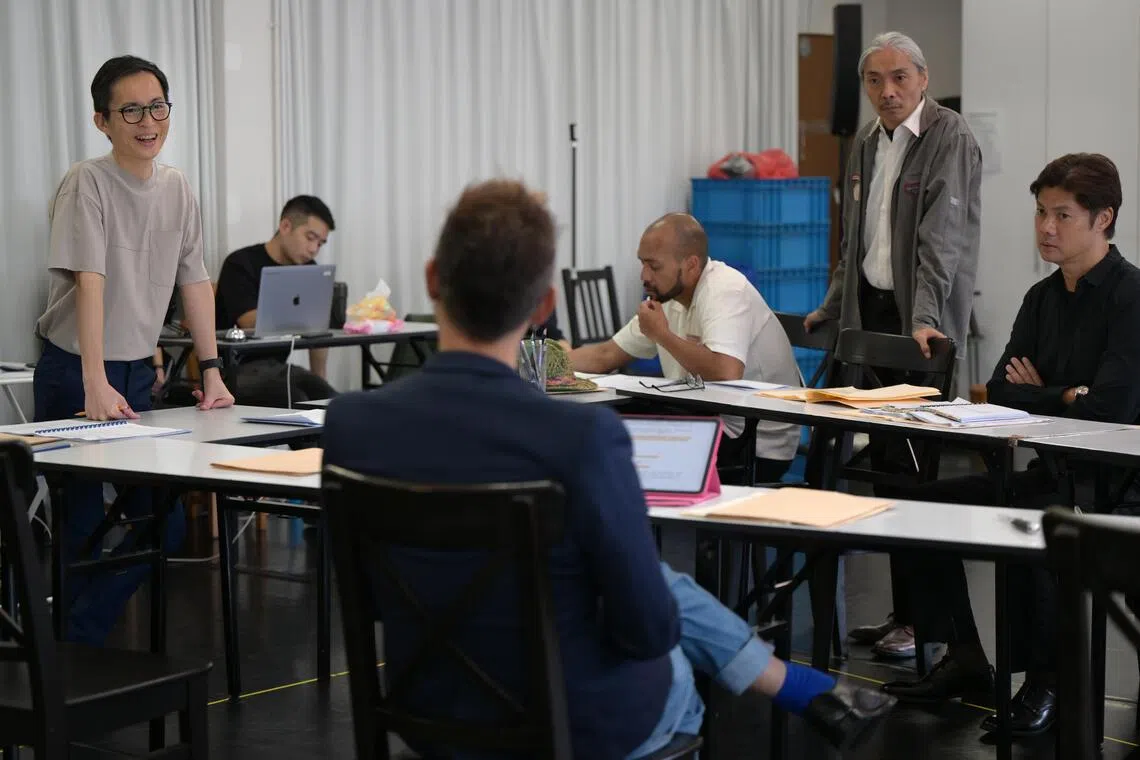 O diretor de “Twelve Angry Men”, Nelson Chia (segundo a partir da esquerda) lembra seus 12 atores de ouvirem com mais atenção durante os ensaios.