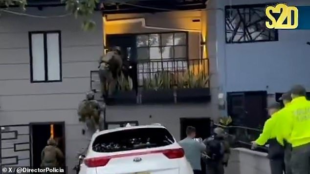 Policiais fortemente armados foram filmados subindo as escadas para chegar ao último andar de um imóvel no centro de Medellín, enquanto outros policiais foram forçados a entrar pela porta abaixo com as armas em punho.