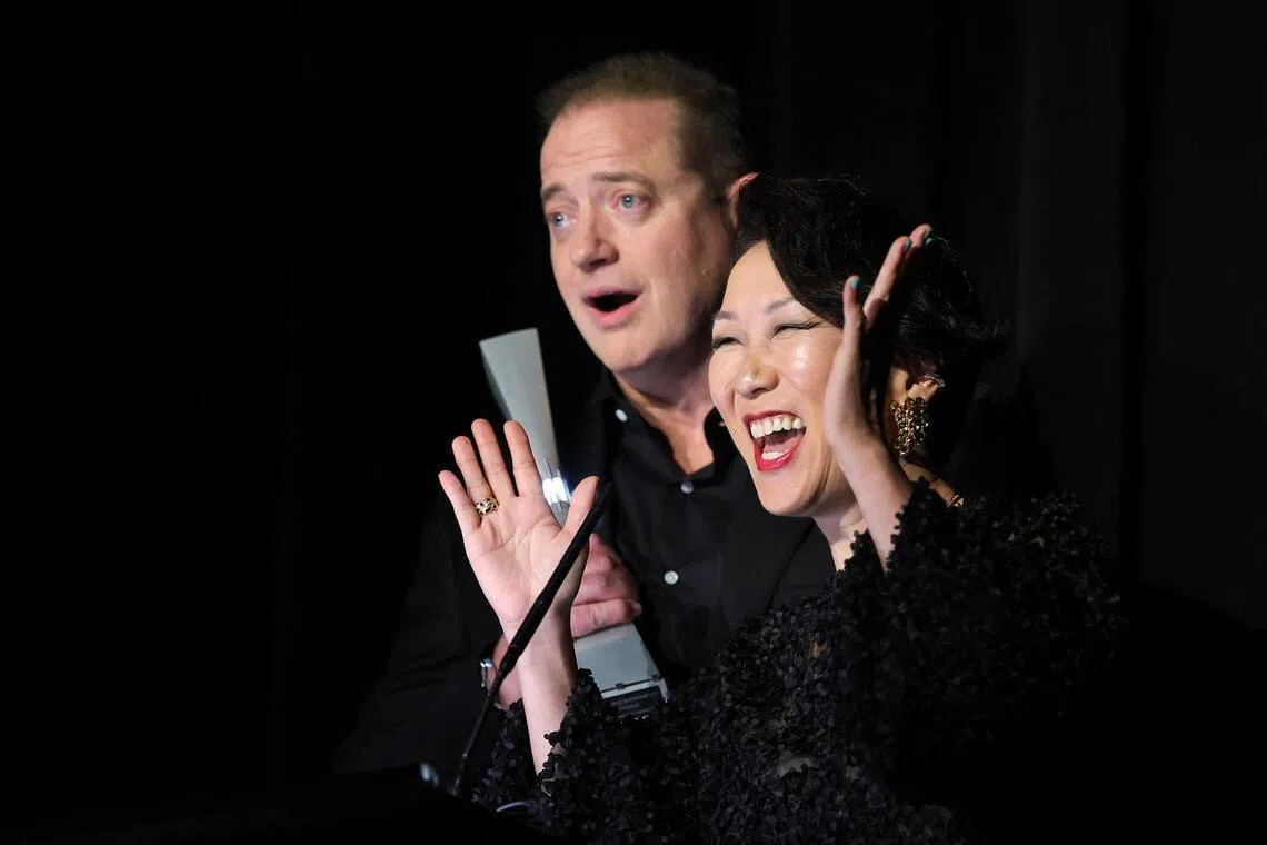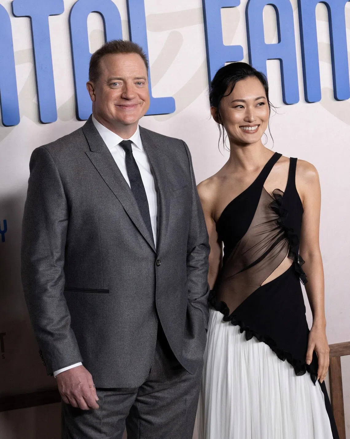O ator Brendan Fraser (à esquerda) e Mari Yamamoto comparecem à estreia de “Rental Family”, realizada em Los Angeles em 12 de novembro de 2025.