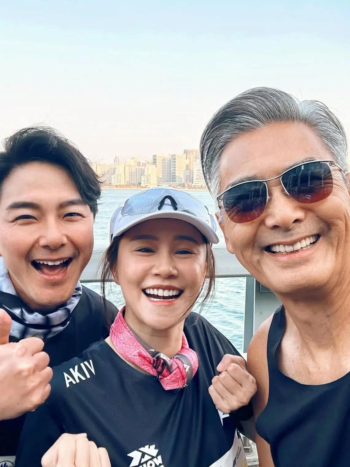 (A partir da esquerda) Edwin Siu, Priscilla Wong e Chow Yun-fat participaram da Maratona Standard Chartered de Hong Kong.