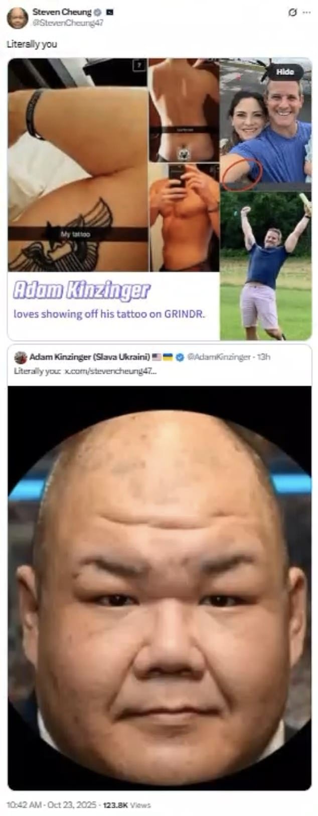 O diretor de comunicações da Casa Branca, Steven Cheung, está fazendo acusações escandalosas contra o ex-republicano Illinois O deputado Adam Kinzinger, 47, é casado com sua esposa há cinco anos e tem um filho.