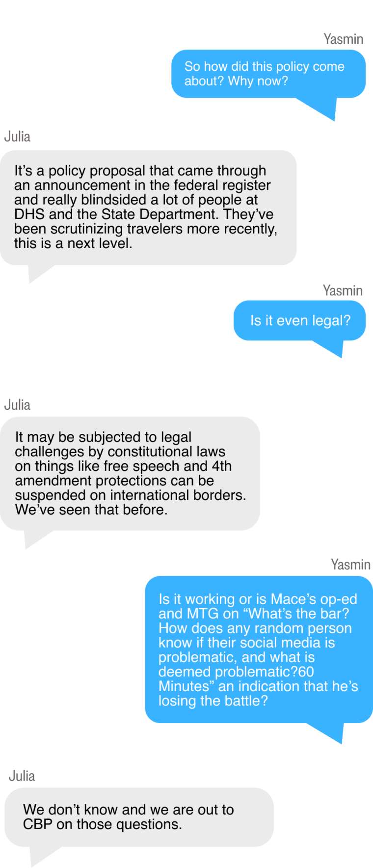 Porém, se você estiver visitando os EUA vindo do exterior e tiver algumas postagens questionáveis ​​nas redes sociais, talvez queira repensar seus planos de viagem. sobre Aqui está o furoconversei com Julia Ainsley, Quem está reportando uma nova política de mídia social que pode afetar muitos viajantes para o estado