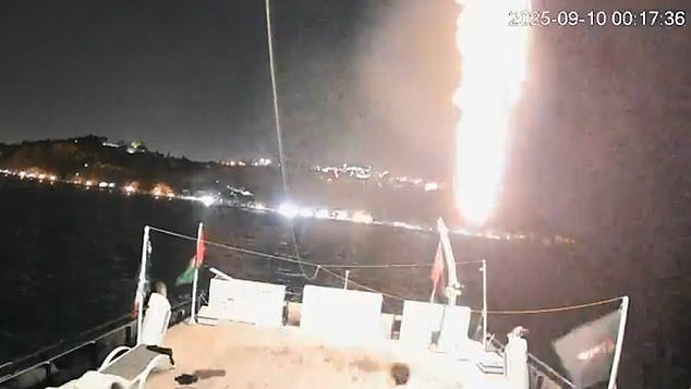 Em imagens dramáticas compartilhadas on -line, um som derretido alto pode ser ouvido antes que um objeto pareça pousar no barco e explodir em chamas.
