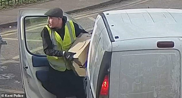 Coates, vestindo uma jaqueta de alta visibilidade e luvas, entrou no prédio de apartamentos em Maidstone, Kent, carregando uma caixa de papelão como adereço.