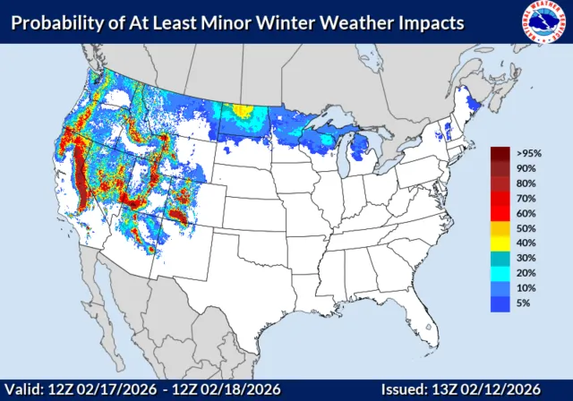O Weather Forecast Center compartilhou mapas que mostram a probabilidade de pelo menos pequenos impactos climáticos de inverno nos Estados Unidos durante os próximos sete dias, com um mapa separado designado para cada dia. Uma probabilidade muito elevada de impacto não começará a ocorrer até 16 de fevereiro.