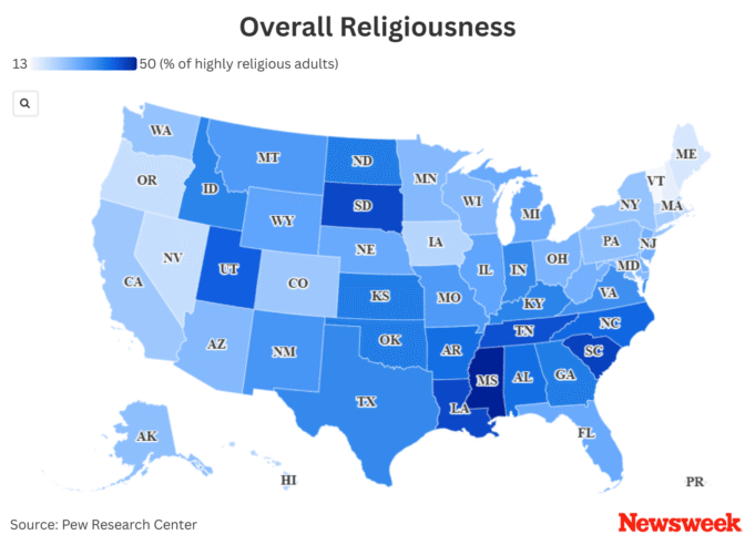 Newsweek Estados máximos e menos religiosos criaram mapas mostrados, No meio da degradação religiosa em todo o paísO Mississippi é o mais alto e o mínimo com Vermont.