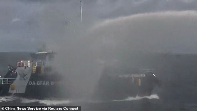 Um navio da guarda costeira chinesa borrifou água num navio filipino antes de este colidir perigosamente perto do sul disputado. China Mar.