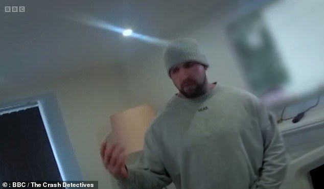 Imagens chocantes mostram o motorista descarado tentando evitar a culpa quando a polícia foi à sua casa em Georgetown, Tredegar, para interrogatório.