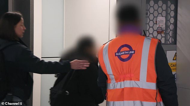 Investigadores que trabalham para a TFL Param a mulher na estação de Ilford na linha Elizabeth em Londres