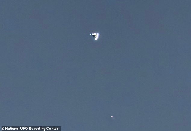 Este par foi capaz de pegar Ambas as fotos e vídeos claros Com uma câmera de celular, ampliando o zoom para ver nove luzes brancas com o casco da OVNI.