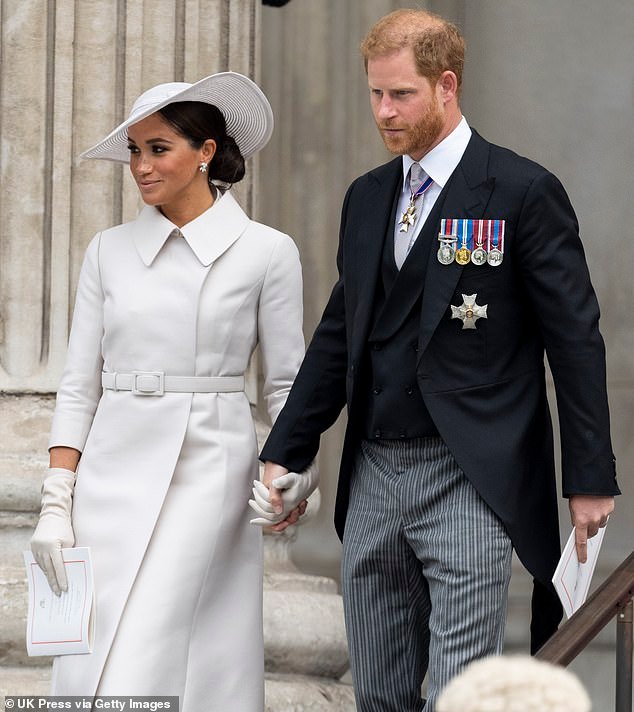 O príncipe Harry, duque de Sussex e Meghan, duquesa de Sussex, participa de um serviço nacional de Ação de Graças pelo domínio do Queens na Catedral de São Paulo em 3 de junho de 2022. A igreja também teve aplausos na multidão, mas também aplausos.
