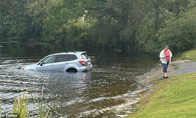 Vestindo uma mulher, camiseta rosa e cardigã, olhe para o carro prateado enquanto a frente afunda na água.