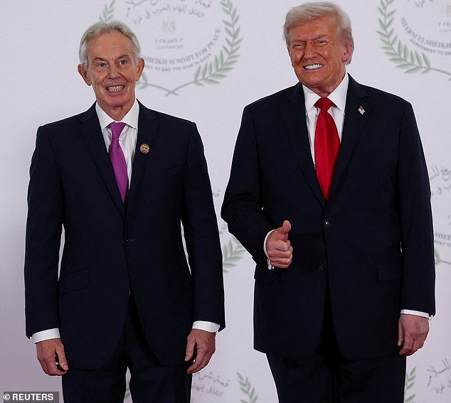 Sir Tony Blair foi visto sorrindo com Donald Trump enquanto participavam da cúpula de paz em Gaza, no Egito, hoje.