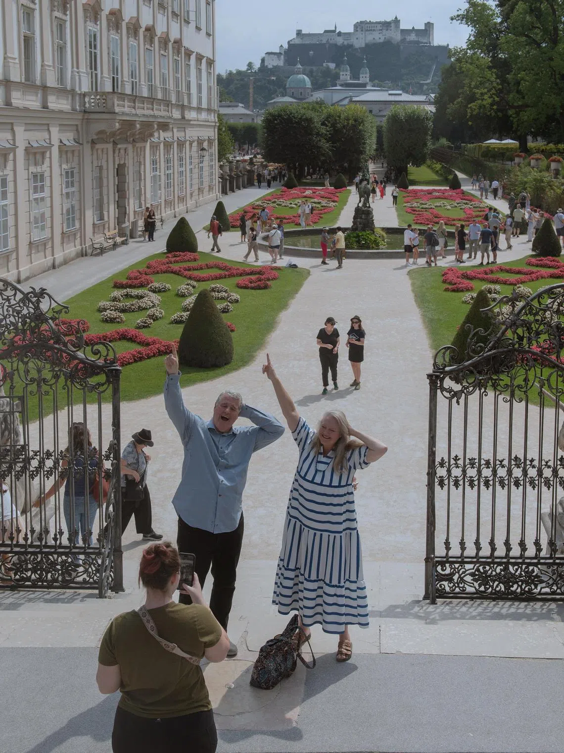 No Mirabell Garden, vimos turistas falarem italiano. Mandarim O inglês então recria os movimentos de dança do Do-Re-Mi das crianças em escadas de mármore, e um amigo tirou uma foto em seu telefone celular. Nora pulou com ela.