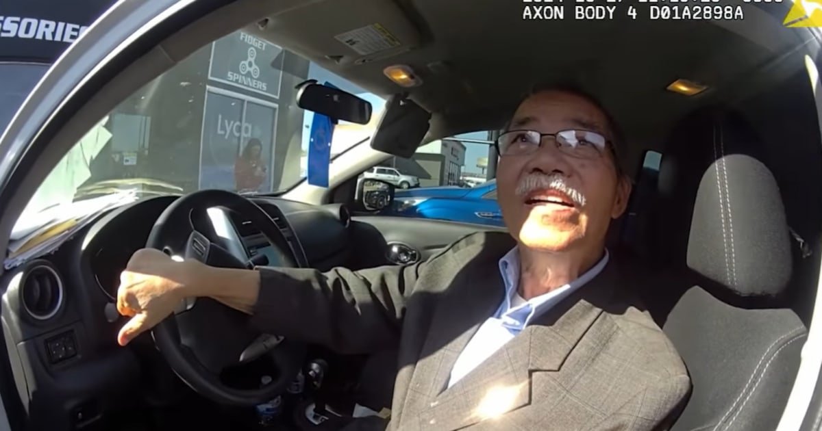 Imagens da câmera corporal do incidente de 27 de outubro mostram Gibson Leach Vu, 71, parando para fazer meia-volta ilegal após um pequeno acidente. No vídeo, Vu nega ter feito meia-volta e diz que seu carro foi atropelado por outra pessoa.