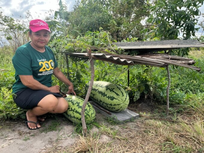 Longo ou redondo como a bola verde externa, vermelha por dentro, assustadora e “ótima”. Melancia cultivada pelo agricultor indígena Katia Maria Pinho da Silva (1) NormandiaInside Roraima. Em sombra e água doce, cultivada em madeira e palha, frutas cortadas são gigantes, com mais de 40 kg de pesos – aproximadamente Três vezes pesado Isso é a maioria deles, que geralmente é de 15 kg.