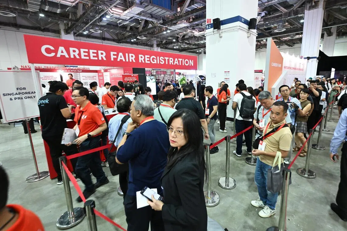 As pessoas fazem fila para se inscrever na feira de carreiras durante o NTUC Career Festival, realizado no Sands Expo and Convention Center em 13 de fevereiro.