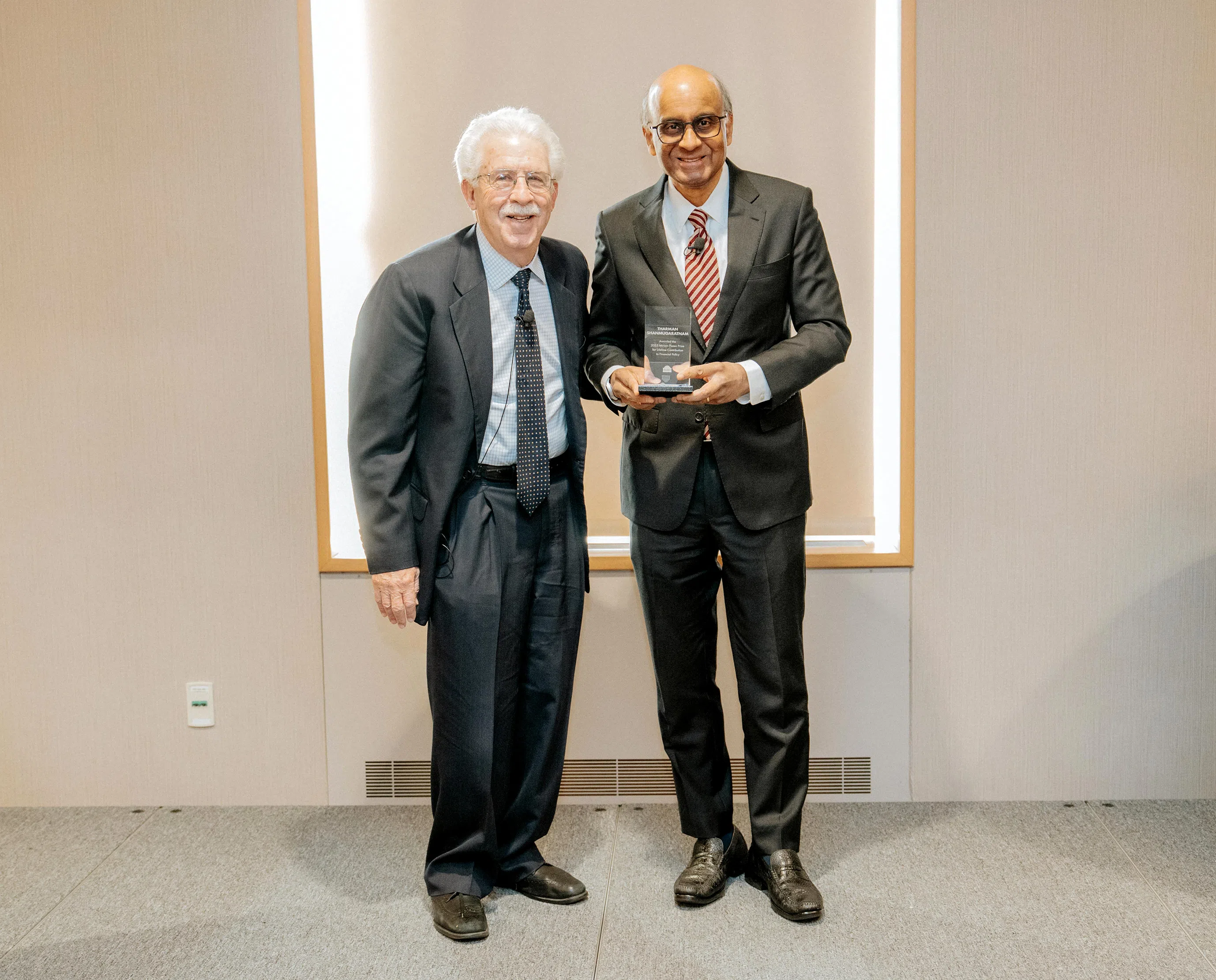 O presidente Thurman Shanmugaratnam (à direita) recebe o prêmio Miriam Posen do MIT Golub Center for Finance and Policy de Robert Posen, professor sênior da MIT Sloan School of Management.