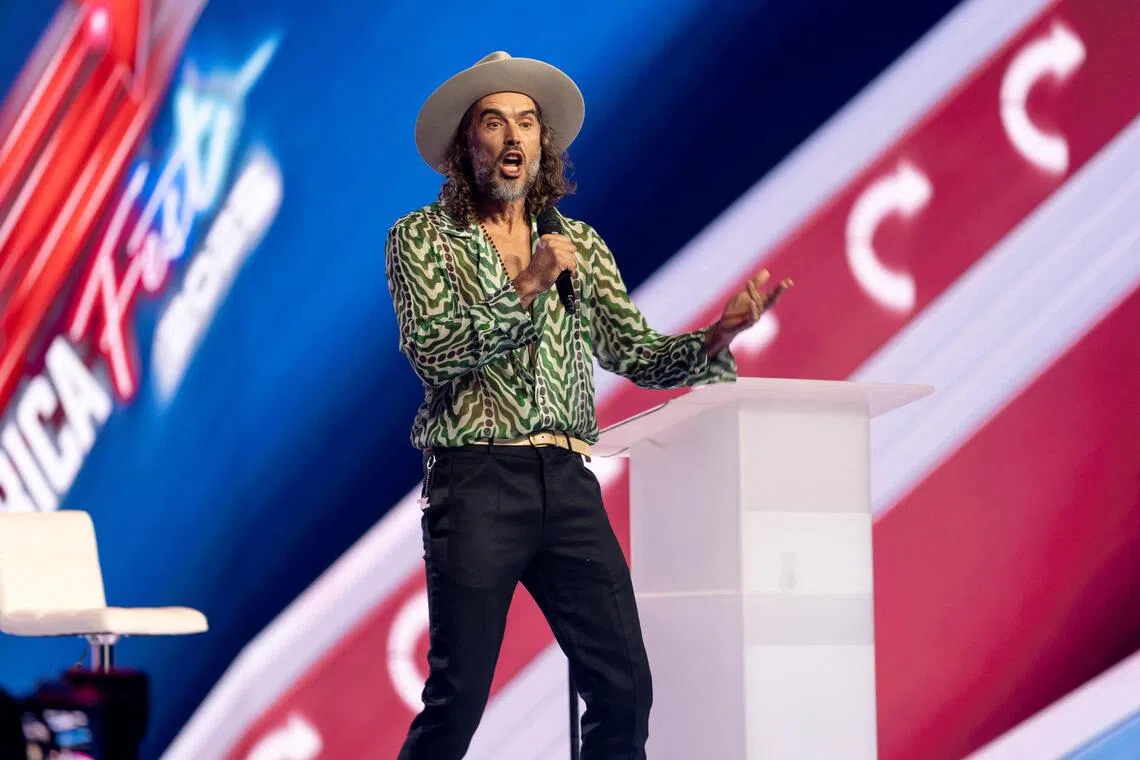 O ator e comediante Russell Brand discursa na cúpula do Turning Point USA, grupo conservador de jovens fundado pelo falecido Charlie Kirk, aliado do presidente dos EUA, Donald Trump, assassinado em setembro de 2025, em 18 de dezembro nos EUA.