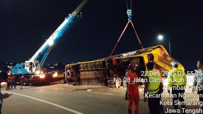Java CentralViva – Evento Acidente experiência solo Ônibus A trans Po Kahaya ocorreu às 00h45 WIB na manhã de terça-feira. O acidente ocorreu quando o ônibus saiu de controle e colidiu com o guarda-corpo do trevo de Krapyak, na estrada com pedágio interno da cidade de Semarang.
