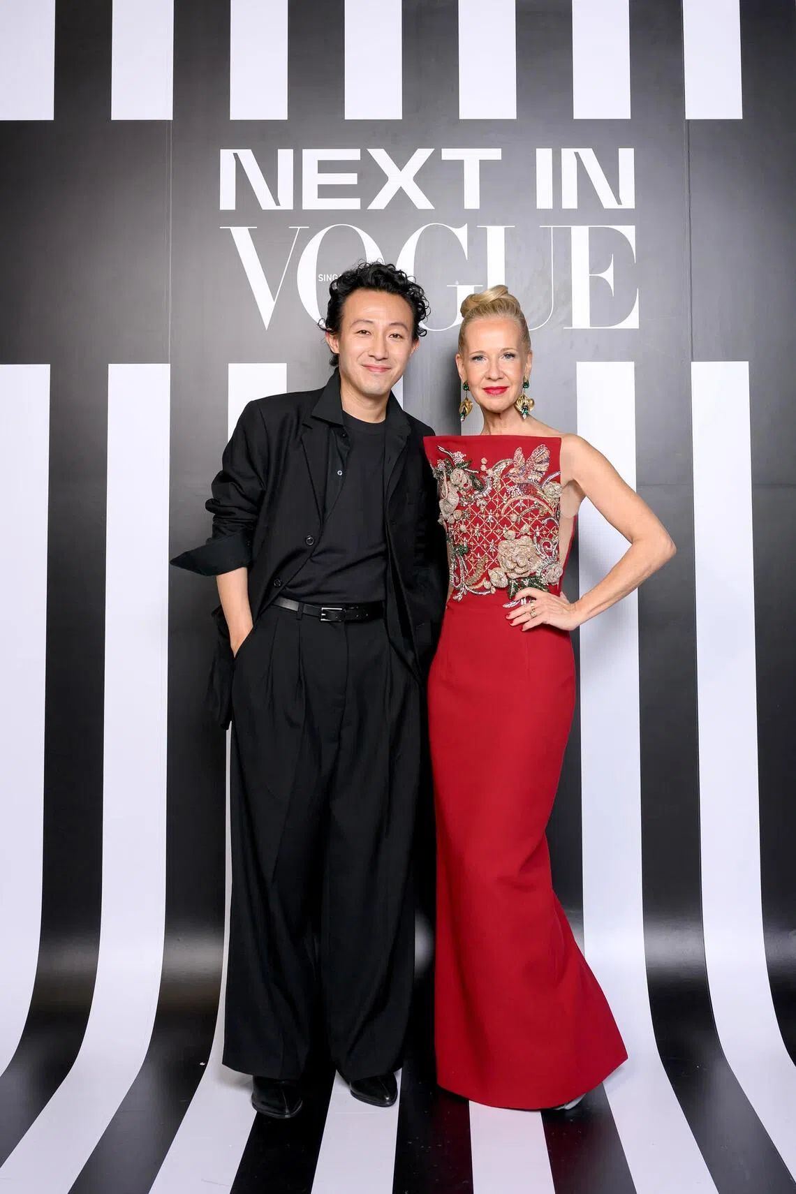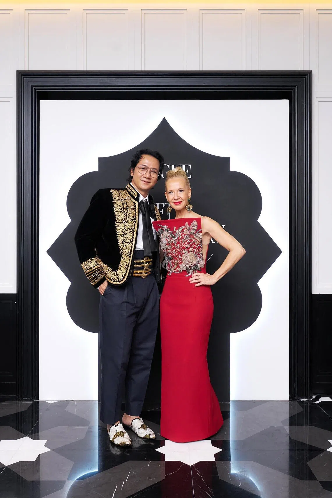 O costureiro Robert Ng, nascido em Hong Kong e radicado em Londres (à esquerda), e a editora da Vogue Cingapura, Bettina von Schlippe, participaram da gala de 18 de outubro.