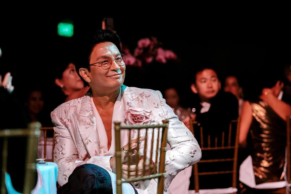 O artista visual e estilista Irwinshah Hassan usa um visual personalizado do designer local Putri Adif na gala de 18 de outubro.