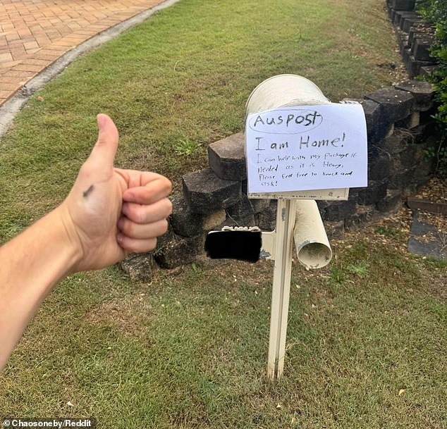 Um cliente do Australia Post deixou um bilhete em sua caixa de correio (foto) dizendo que estava em casa