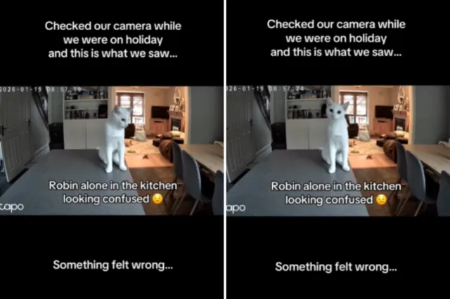 O vídeo, compartilhado pela dona irlandesa de animais de estimação Bibiana Readhorst, 51, mostra seu gatinho Robin, de seis meses, sentado sozinho no balcão da cozinha enquanto a família está de férias. O texto sobreposto diz: “Robin sozinho na cozinha parecendo confuso” – seguido pela linha assustadora, “Algo deu errado…”