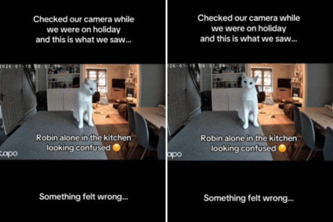 O vídeo, compartilhado pela dona irlandesa de animais de estimação Bibiana Readhorst, 51, mostra seu gatinho Robin, de seis meses, sentado sozinho no balcão da cozinha enquanto a família está de férias. O texto sobreposto diz: “Robin sozinho na cozinha parecendo confuso” – seguido pela linha assustadora, “Algo deu errado…”