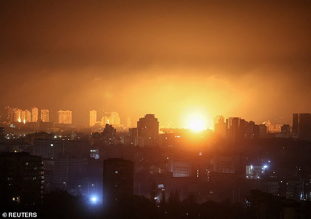 Uma explosão ilumina o horizonte da cidade durante um ataque russo com mísseis e drones em Kiev, Ucrânia, em 14 de novembro de 2025, em meio ao ataque da Rússia à Ucrânia.