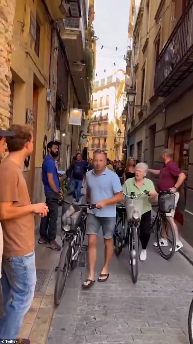 Este é o momento tenso em que os espanhóis cercaram os turistas e gritaram para eles “saírem”, depois que os turistas de bicicleta entraram em uma rua de pedestres.