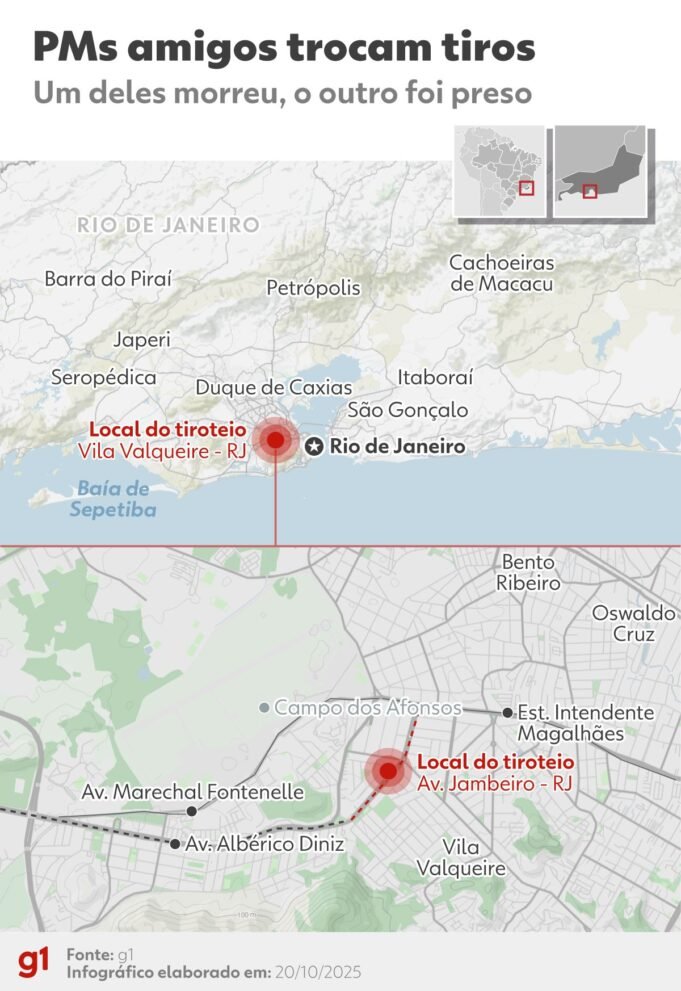 Antes de o primeiro-ministro ser morto pelo amigo William Amaral da Concesio, Eduardo Felipe Santiago Ferreira chegou a implorar para não morrer. “Amaral! Amaral! Você está maluco? Sou eu, Santiago, irmão!”, disse a vítima. “Foda-se! Eu vou te matar!”, respondeu o sujeito. “Amaral, é Santiago!”, insistiu outro. Fútil: Santiago morre em tiroteio com pelo menos 8 balas. g1 descreve o crime com base na gravação de uma câmera de segurança. Quem está envolvido? Progênie de William Amaral da Conceição e Eduardo Philip Santiago Ferreira Eduardo Philip Santiago Ferreira, Sargento Santiago, 18º BPM (Zacarepaguá), falecido; O sargento Amaral William Amaral da Concecio, do 40º BPM (Campo Grande), foi ferido e preso em flagrante. Eles compareceram ao batismo dos filhos e ficaram em hiato. Onde foi o tiroteio? Mapa mostrando o local do tiroteio Infográficos: Verônica Medeiros/G1 Foi em frente à Avenida Zambeiro, 525, em Villa Valcare, zona sudoeste do Rio de Janeiro. Apenas meia-noite de domingo (19), quando chovia forte. Como a luta começou? O motivo da troca de tiros não era conhecido até a última atualização deste relatório. Agora veja o que é conhecido. Descendo o Pouso do Amaral Reprodução/TV Globo Condomínio Foto da câmera, o Fiat Idea que transportava Santiago e Amaral para no meio da faixa direita do canal da Avenida Jambeiro. Um aplicativo para motociclistas continuarem buzinando, reclamando e manobrando. Santiago, que estará ao volante, sai com dificuldades para os passageiros. Já na pista, ele tenta conversar com o amigo. “Amaral! Amaral! Amaral! Amaral, você está maluco?”, repetiu. O amigo também sai de Idea, já com uma pistola na mão, mas de forma desajeitada. Amaral acaba rolando no asfalto e não larga a arma mesmo após cair. “Foda-se!”, ele jura. Ela se levanta e segue Santiago, atordoada. Por mais alguns segundos de mais súplicas e disparos, os sargentos saem do quadro. Santiago reaparece na frente do carro, ainda desarmado, e aperta a mão para se acalmar. “Eu vou matar você!” Amaral disse. “É Santiago, irmão!”, responde. Amaral, ainda fora de enquadramento, atira. Santiago então tirou uma pistola da cintura e disparou de volta. Ele tenta se esconder na porta do passageiro ainda aberta, mas Amaral o persegue. Valqueire Reprodução/TV Globo Bangue-bangue Troca de tiros contra Tempestade. Santiago, fora do alcance da câmera, atira novamente. Amaral se afasta alguns metros da frente do Idea e volta para o lado do motorista, onde também está o amigo. Ao longe, você ouve a buzina – nenhum outro veículo passa. O homem caído no chão dá a volta no Santiago Fiat no sentido anti-horário, em direção à porta aberta. Amaral se aproxima e atira, desta vez atingindo o amigo no peito, que cai no chão. Ao cair, ele bateu a cabeça na porta do passageiro, que forçou a fechar. Um último tiro é ouvido. Um carro e uma moto passam na saída de Santiago. Santiago morre no local.Reprodução/TV Globo Uma equipe do batalhão de Santiago foi chamada após o confronto e o encontrou morto. Amaral sentou-se com a arma do crime. Ele foi preso em flagrante e levado sob custódia no Hospital Municipal Albert Schweitzer, em Realengo, e depois transferido para o Hospital Central da PM, em Estácio. Ele já foi liberado. Amaral disse à polícia que não se lembra do momento do tiroteio. Ele também relatou ao Primeiro-Ministro que foram vítimas de uma tentativa de assalto antes da chegada da Polícia Civil. No entanto, não há evidências de ataque.