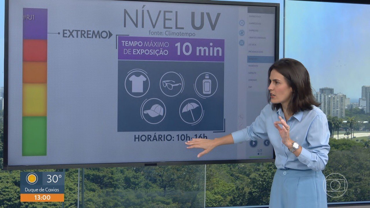 Segundo o Climatempo, a cidade pode chegar a 25%. O índice UV na capital fluminense é considerado extremo. Temperaturas em torno de 40 graus Celsius são previstas no Rio nesta quinta-feira. O município do Rio de Janeiro atingiu o nível de calor 2 (NC2) nesta quarta-feira (27), às 11h20. É o segundo dos cinco níveis definidos pelo Centro de Operações do Rio (COR) para registrar o calor da cidade e seu impacto na população. Segundo o Climatempo, o Rio pode registrar cerca de 40 graus Celsius na quinta (28) e a umidade está muito baixa, em torno de 25% à tarde. Nesta quarta-feira, um sistema de alta pressão mantém o clima estável com dia ensolarado, quente e seco em todo o estado do Rio de Janeiro. A máxima prevista é de 38 graus Celsius. A umidade do ar também é baixa. O índice UV na capital fluminense é considerado extremo. Isso significa que o tempo máximo de exposição solar sem proteção é de 10 minutos. Os efeitos dos raios UVB incluem vermelhidão e queimação. Os raios UVA causam rugas e manchas. Ambos os tipos causam câncer de pele. O Rio atingiu o nível de calor 2 nesta quarta-feira (27). As recomendações aos Cidadãos da Reprodução/TV Globo COR são: Aumente a ingestão de água ou sucos naturais de frutas sem açúcar mesmo que não tenha sede. Faça refeições leves, como frutas e salada. Use roupas leves e frescas. Evite bebidas alcoólicas com alto teor de açúcar, pois podem causar desidratação. Evite a exposição solar direta, especialmente entre as 10h00 e as 16h00. Conheça o nível de calor na cidade do Rio de Janeiro pelas redes sociais e pelo centro de operações e pela secretaria municipal de saúde. O calor pode ser mais prejudicial para pessoas com pressão alta, diabetes ou doenças cardíacas. Cuidados com animais de estimação: Evite passear entre 10h e 16h e verifique a temperatura do solo. Não se esqueça de fornecer água limpa. Dê água às crianças e aos idosos com frequência, mesmo que não tenham sede. A cidade do Rio de Janeiro atingiu o nível de calor 2 (NC2) nesta quarta-feira (27), às 11h20. Reprodução/TV Globo