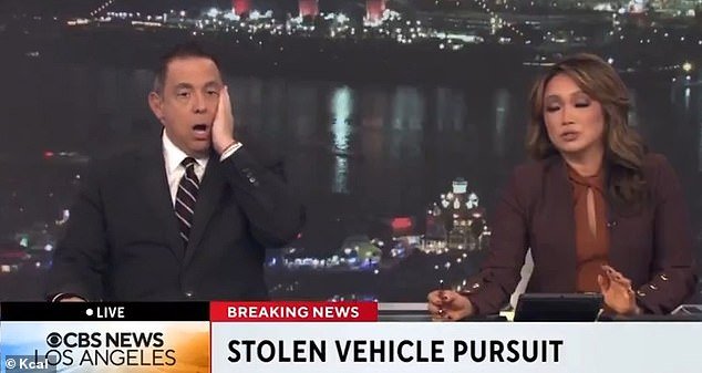 Os âncoras da KCBS-TV, Juan Fernandez e Suzy Suh, ficaram surpresos quando lhes mostraram imagens ao vivo de uma perseguição policial que atingiu mortalmente um homem em uma rodovia.