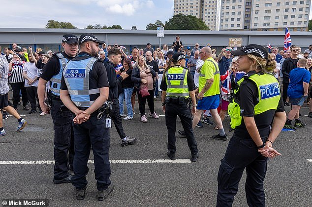A questão da imigração ilegal surge no meio de semanas de protestos à porta dos chamados hotéis de asilo, como o protesto em Falkirk acima