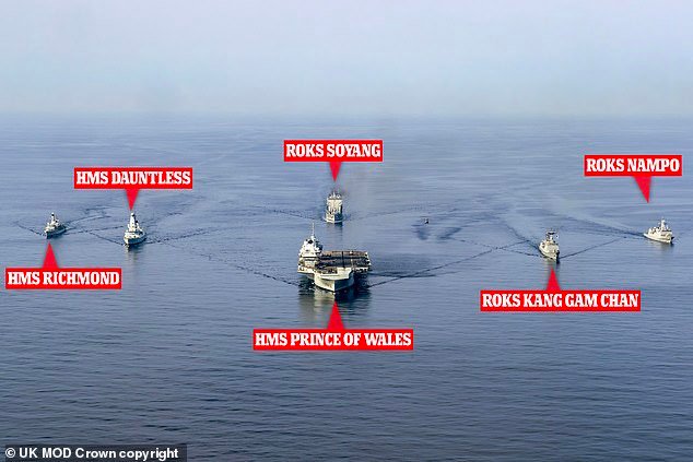 Três dos navios de guerra mais importantes da Grã -Bretanha estão realizando vários navios militares sul -coreanos, bem como uma performance de força.