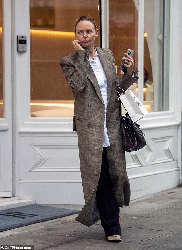 Vestindo um longo casaco trespassado de tweed, Stella McCartney, 54, foi flagrada esperando na recepção pela celebridade especialista em cuidados com a pele Karen Bartow e parecendo cada vez mais irritada.