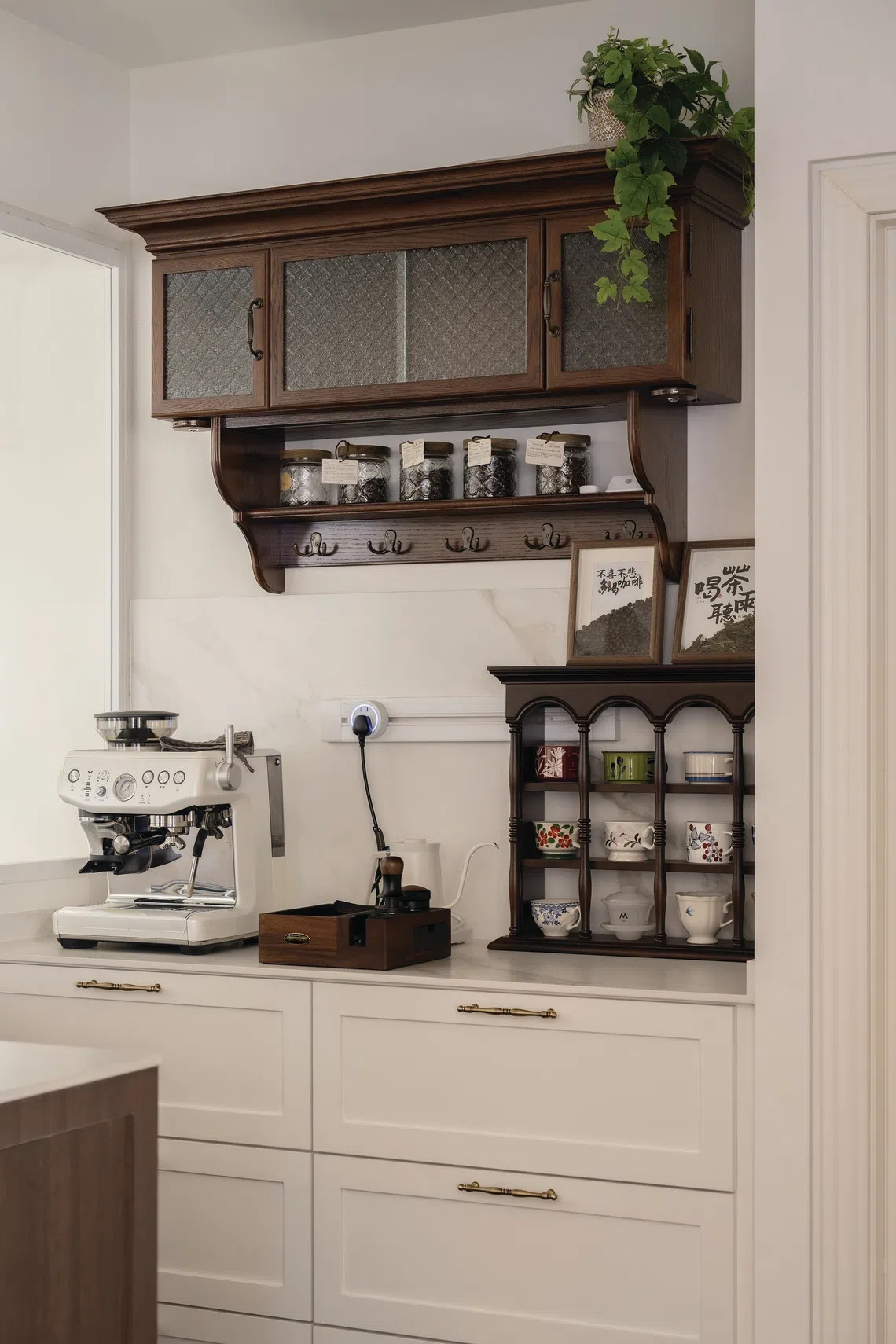 Portas e utensílios de cozinha de cores claras proporcionam um contraste elegante com bancos de bar e armários de armazenamento de cores escuras. A estação de chá e café tem uma coleção de xícaras que pertencem à minha esposa.