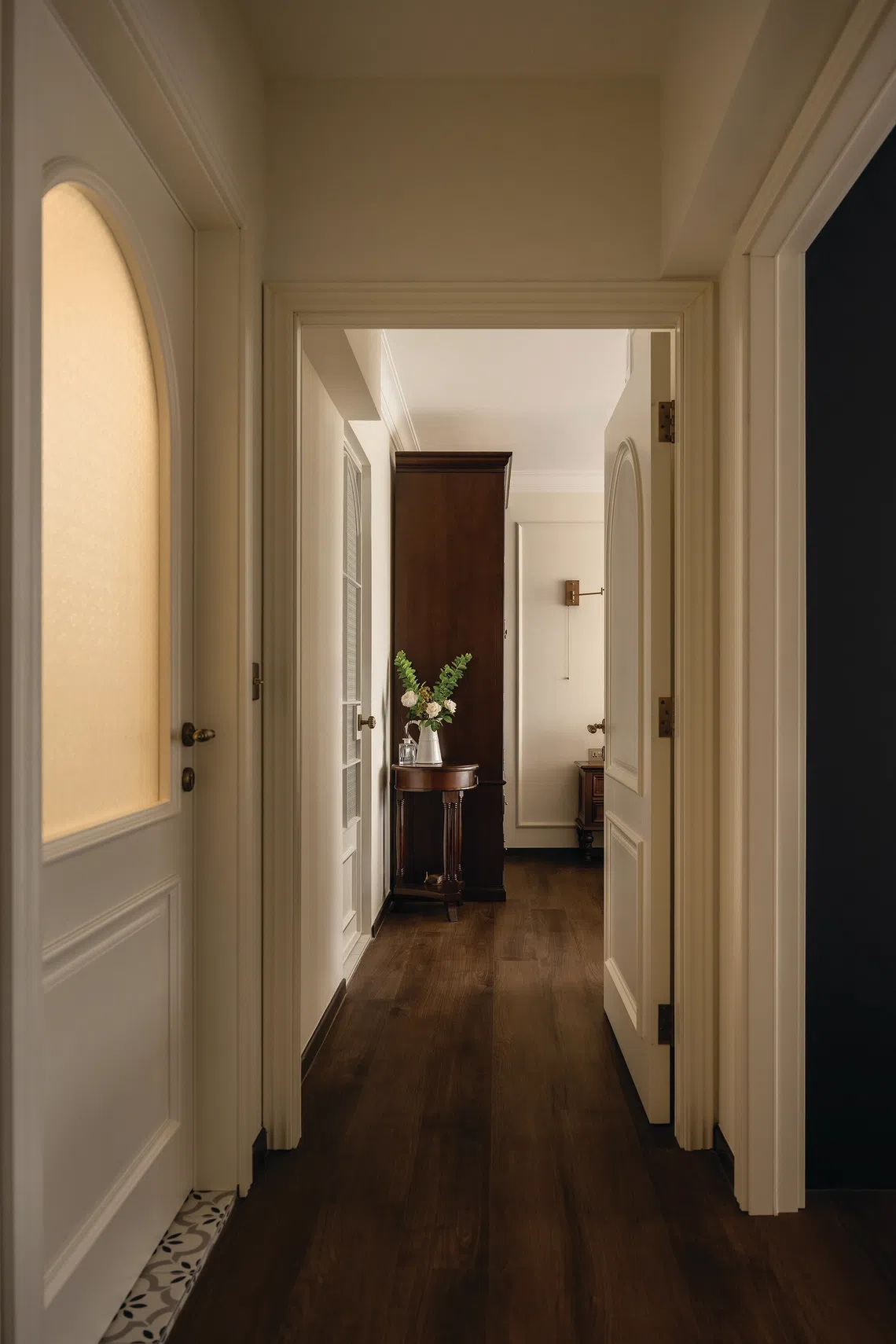 Tons creme no corredor do apartamento.