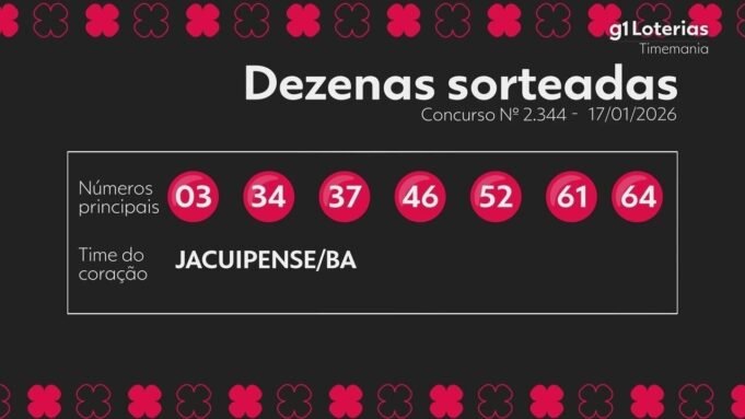 Resultados do Timemania g1 Confira abaixo os números do sorteio da competição 2344 da Timemania, realizado neste sábado (17): Dezenas: 3 – 34 – 37 – 46 – 52 – 61 – 64 Time do coração: JACUIPENSE/BA Confira os resultados do sorteio da Timemania. Veja quantas apostas foram feitas em 2.344 concursos: ninguém acertou 7 acertos e a premiação chegou a R$ 3 milhões; 6 acertos: 2 apostas vencedoras, cada uma receberá R$ 45.322,34; 5 acertos: 57 apostas vencedoras, cada uma recebendo R$ 2.271,79; 4 acertos: 1.516 apostas vencedoras, cada uma recebendo R$ 10,50; 3 acertos: 13.562 apostas vencedoras, cada uma recebendo R$ 3,50; Time do Coração: 2.809 apostas vencedoras, cada uma recebendo R$ 8,50. O próximo sorteio será realizado na terça-feira (20). 📱Baixe o aplicativo do g1 para ver notícias em tempo real e gratuitas Encontrou algum erro nesta informação? Escreva para g1. Como jogar Timemania No Timemania você deve escolher 10 números dos 80 disponíveis no volante e um time favorito. Sete números são sorteados e as apostas que acertarem entre três e sete números vencem. Há também prêmio para o time do coração que acertar. Também é possível escolher a Surpresinha: nesse método, os números são escolhidos pela Caixa Econômica Federal, que administra as loterias. Outra opção é repetir a sorte com o Timosinha por 12 partidas consecutivas. Aposta: Ganhe um prêmio se acertar 7 respostas corretas; São 6 acertos; Existem 5 acertos; Existem 4 acertos; Tem 3 acertos. As apostas que acertarem o time do coração também ganham prêmios. O valor da aposta é de R$ 3,50. A categoria de premiação é a seguinte: R$ 3,50 para apostas com 3 acertos; R$ 10,50 para apostas com 4 acertos; R$ 8,50 para aposta no Team Do Curaçao. O restante é dividido da seguinte forma: 50% para apostas com 7 acertos; 20% das apostas com 6 acertos; 20% para apostas com 5 acertos; Os 10% restantes são acumulados e distribuídos para quem acertar 7 números nos 0 ou 5 concursos finais. Chances de Sucesso Sorteio Timemania A Timemania realiza três sorteios semanais, às terças, quintas e sábados, às 21h. Este relatório é gerado automaticamente com dados fornecidos pela Caixa Econômica Federal. Clique aqui para saber mais. Caso haja novas informações relevantes, o relatório poderá ser atualizado.
