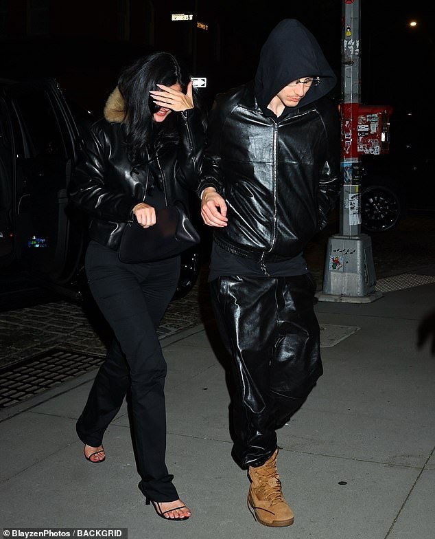 O casal da lista A foi fotografado combinando looks de couro preto na cidade de Nova York na noite de segunda-feira, enquanto Jenner cobria o rosto com a mão.