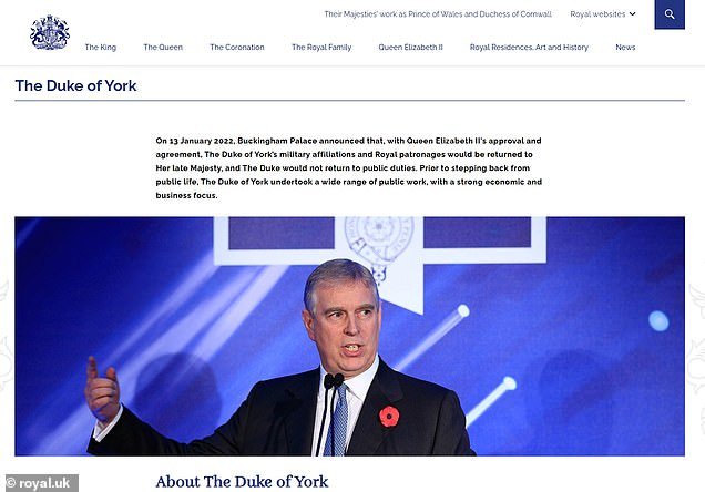 Hoje diz: ‘Em 13 de janeiro de 2022, o Palácio de Buckingham anunciou que rainha Isabel IIApós aprovação e acordo, as afiliações militares e patrocínios reais do Príncipe Andrew serão devolvidos a Sua Majestade, e o Príncipe não retornará às funções públicas. Antes de se retirar da vida pública, o Príncipe André realizou uma vasta gama de compromissos públicos com um forte enfoque económico e empresarial.