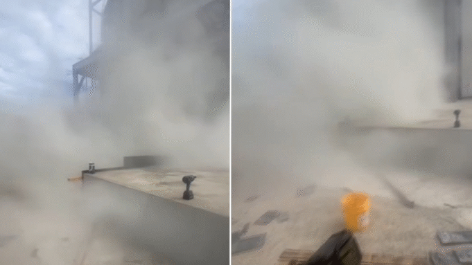 Imagens dramáticas mostram uma explosão repentina em um local de trabalho na sexta-feira, com uma espessa nuvem de pó de cimento engolfando a área em segundos.